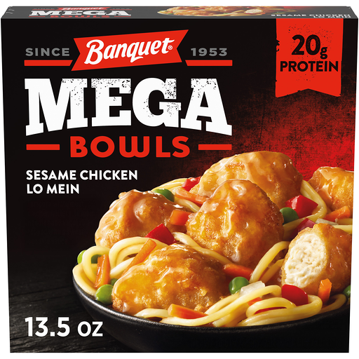 Banquet Mega Bowls Sesame Chicken Lo Mein frozen meal brings exciting flavor to your table. Featuring tempura white meat chicken fritters topped with a sweet sesame sauce and vegetables over Lo Mein noodles for a delicious sesame chicken Lo Mein bowl with a kick. This frozen chicken bowl offers 20g protein per serving to put hunger in its place. Enjoy Banquet Mega Bowls as flavorful frozen lunches or quick and easy frozen dinners any day of the week. Preparation of these ready made meals is easy. Just follow the instructions on the box to heat the frozen food in the oven for fresh-baked flavor or in the microwave for quicker cook time. Store the 13.5 ounce frozen meal in the freezer until you’re ready to enjoy. Banquet Mega delivers hearty meals that will keep bringing you back for more.